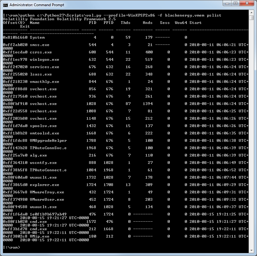 Now, I will use one of the standard plugins to display a couple different formats. PSList gives us a basic list of all the processes running on the computer at the time the memory image was acquired.