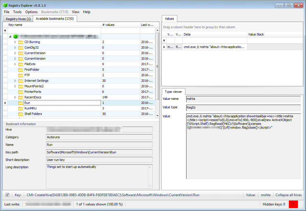 The path referenced in the run value and pictured below is HKCU\Software\Licenses. I have blurred some code and value names in an abundance of caution for potential unique identifiers.