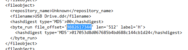The dfxml output will provide the offset in the image where a non-low entropy sector block was identified. This is important to help limit to false positives where a low value block could appear across multiple good and evil files. Entropy is the measurement of randomness. An example of an low entropy block would be one containing all 0x00 or 0xFF data for the entire sector.