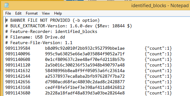 Inside the USBOut output folder, there is a text file called identified_blocks.txt that records the matching hashes and image offset location. If the generated hashdb database contained multiple files, the count variable will tell you how many files contained a matching hash for each sector block hash.